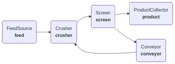 This example demonstrates how to build a dynamic crusher circuit simulation using Plugboard, based on the Population Balance Model (PBM) approach widely used in mineral processing.